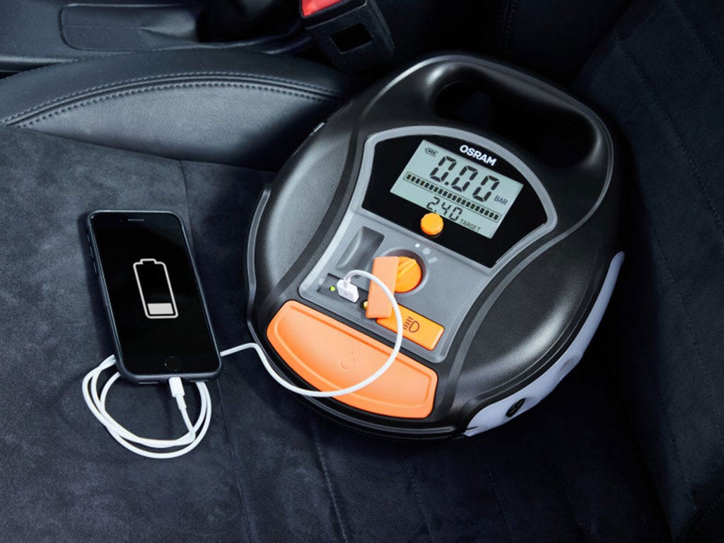 Få snabbt dina däck till deras optimala tryck med den trådlösa och uppladdningsbara OSRAM TYREinflate 6000. Det tar bara två minuter att blåsa upp ett 13" däck.